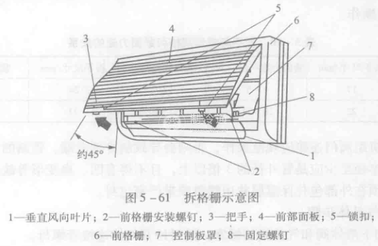 排水實驗:用手指上下扳動風向葉片,使其處于水平位置,向上打開螺旋旦,拆下固定螺釘,向前拉格柵的左下側和右下側,,并將其筆直向上抬起,使格柵內緣頂部約2個凸出部脫離其槽口,從機殼上把格柵拆下(新型的格柵是通過夾子固定的,在拆印時對壓格柵,然后上抬即可打開),如圖5-61所示。然后將一杯水倒人排水槽內,觀察水的導流是否順暢。