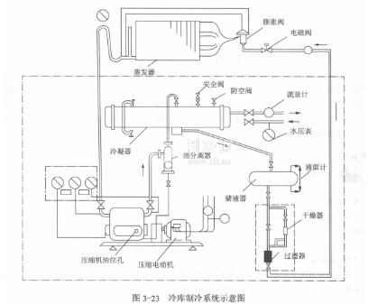 冷庫的制冷循環裝置可分為兩部分:制冷機系統和冷卻系統。通常情況下,制冷機系統部分設置在庫外的機房內,冷卻系統設在庫內。如圖3-23所示,圖中虛線框內部分即為制冷劑系統。