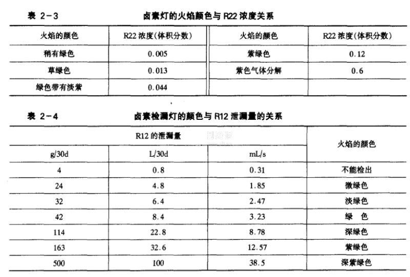 隨氟利昂制冷劑的泄漏量不同,鹵素?zé)粲芯G色、亮綠色、紫色等不同顏色的火焰,火焰顏色與R22濃度關(guān)系見(jiàn)表2一3,鹵素檢漏燈的顏色與R12泄漏量的關(guān)系見(jiàn)表2一4。