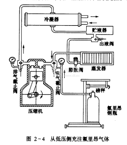 向氟利昂系統(tǒng)內(nèi)充注氟利昂制冷劑時(shí),一般在制冷機(jī)的低壓吸氣側(cè)注入氣體(見(jiàn)圖2一4),利用制冷機(jī)的真空逐漸吸入氣體。系統(tǒng)充注氟利昂制冷劑時(shí),氟利昂鋼瓶應(yīng)在充灌前、后稱重并記錄,以便計(jì)算氟利昂制冷劑充入量。