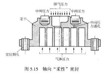 ②軸向“柔性”密封如圖5.15所示,壓縮機(jī)定子在軸向留有1mm的活動(dòng)間隙,在正常運(yùn)行條件下,渦旋定子受氣體的壓力(排氣壓力及與壓縮腔相通的中間壓力)作用,定子緊密與轉(zhuǎn)子結(jié)合形成斷面密封,當(dāng)定子上端面氣體壓力減少或消失時(shí),會(huì)產(chǎn)生渦旋定子頂端與轉(zhuǎn)子微量的分離現(xiàn)象,實(shí)現(xiàn)“卸載”。當(dāng)有液體、雜質(zhì)時(shí),會(huì)產(chǎn)生壓縮腔內(nèi)壓力升高現(xiàn)象,將定子頂起,壁面:濕壓縮“的故障,軸向“柔性”密封又有利于“卸載起動(dòng)”利用軸向“柔性”密封,產(chǎn)生了“數(shù)碼渦旋壓縮機(jī)”。