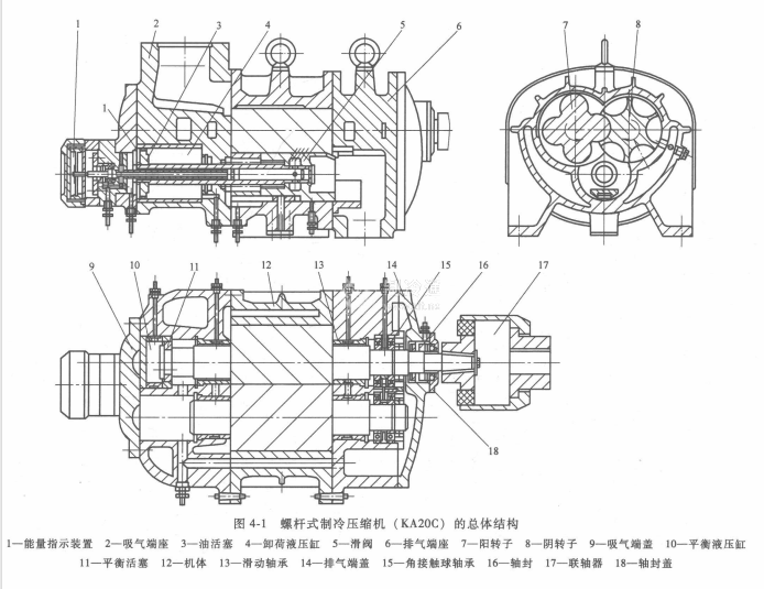 一般陽(yáng)轉(zhuǎn)子有四個(gè)凸而寬的齒,陰轉(zhuǎn)子有六個(gè)凹而窄的齒。與一對(duì)螺旋齒輪相似,相互咬合,凸齒逐漸地在齒溝的總長(zhǎng)度上移動(dòng),達(dá)到壓縮的目的,并更進(jìn)一步促進(jìn)吸氣。螺桿式制冷壓縮機(jī)的結(jié)構(gòu)如圖4-1所示。
