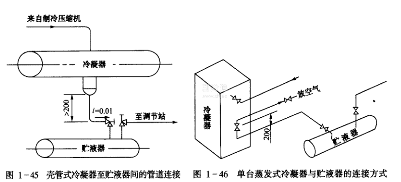 冷凝器中的液體是利用重力經管道自由流入貯液器的。為保證排出暢通,冷凝器與貯液器之間應保證有一定高度差,冷凝器與貯液器之間截止閥安裝位置應距冷凝器下部200mm以上,如圖1一45所示。管道中液體最高流速應不大于0.5m/s。水平管段應有不小于1/50的坡度,坡向貯液器。
