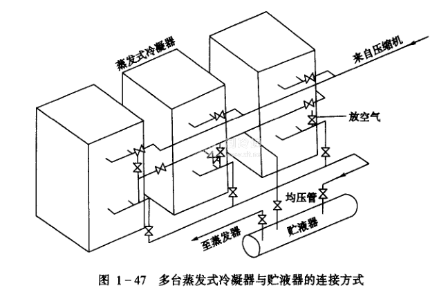 單臺蒸發式冷凝器可利用液體管自身均壓,管道流體流速應不大于0.5m/s,水平管應有1/50的坡度,坡向貯液器。蒸發式冷凝器出液口至水平管段的垂直距離不小于200mm;蒸發式冷凝器與貯液器之間不設均壓管時,應在貯液器上安裝放空氣閥,見圖1一46。