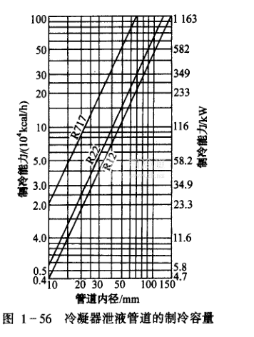 從冷凝器到貯液器的液體管道,稱為冷凝器的泄液管道。當液體流速為0.5m/s,液體溫度為40℃,蒸發溫度為一20℃時,其管道內徑與相應制冷機的容量見圖1一56。如冷凝器到貯液器的頂端設計足夠的氣相平衡管道時,則圖中的管道容量可以提高50%。