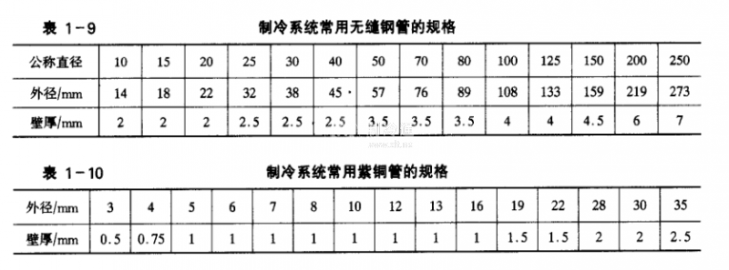 制冷系統(tǒng)的管道承受制冷劑的壓力,除管材應符合質量標準外,對管道的壁厚也有一定的規(guī)定,使其符合安全生產的要求。常用無縫鋼管及紫銅管的規(guī)格見表1一9和表1一10.