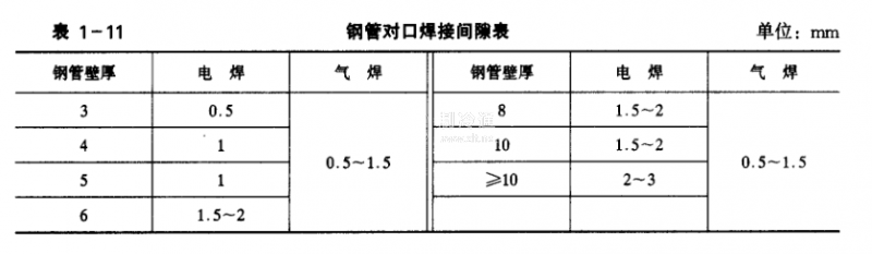焊接大口徑鋼管時,為使焊接牢固需對焊,按管口進行鈍邊及30°一35°坡口處理,V型坡口為60°--70°。如圖1一57所示。管道焊接后應平直,不能有彎曲和錯口現象。焊接時管子對口應有一定的間隙(見表1一11)。為保證焊接質量,每一焊縫的修補不得超過兩次,否則應將焊口鋸掉,對管口進行處理并重新焊接。