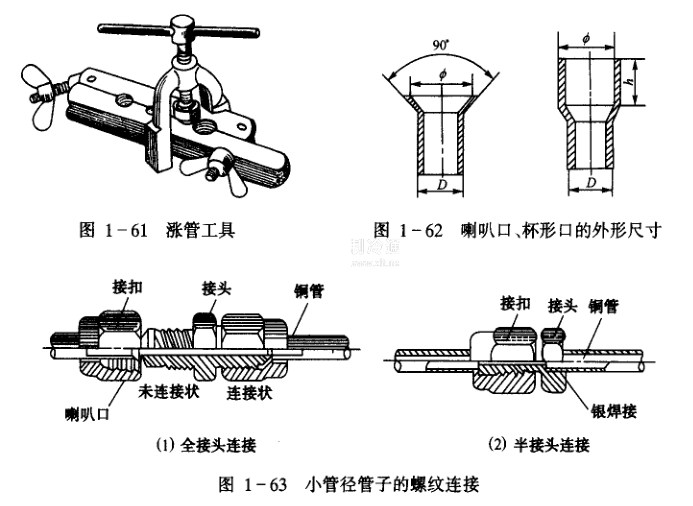 ④喇叭口連接:連接管徑小于22mm的紫銅管時,可用漲管工具將管口做成喇叭口形狀(見圖1一61、圖1一62和圖1一63),用管接頭和接管螺母壓緊連接。