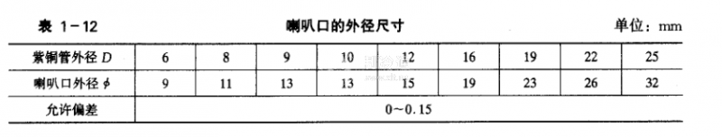 制作喇叭口時,先將接管螺母套在紫銅管上,再用漲管器將紫銅管管端制成喇叭口。制作前應將紫銅管端部進行退火處理,以免喇叭口處的管壁裂開。喇叭口制好后,將接管螺母與接頭擰緊即可。喇叭口的外徑尺寸見表1一12。