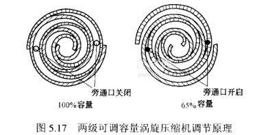 如圖5.17所示,兩級可調容量渦旋壓縮機在渦旋定子端面一定位置打兩個小孔,并將小孔在定子端面上用一連接管引至控制閥。當控制閣關閉,壓縮處于制熱狀態,此時為100%的容量。當開啟控制閥,旁通口開啟,中間壓力的氣體勞通與吸入氣體混合,實現65%左右的吸氣容量的調節。這樣,有效地解決了冬季、夏季壓縮機容量的匹配。由于不改變壓縮機的轉速,避免了低轉速時對潤滑的影響與高轉速時壓縮機噪聲與振動加大的影響,避免了空調機組整機加裝輔助電加熱系統的要求,并可適應部分負荷的需要。