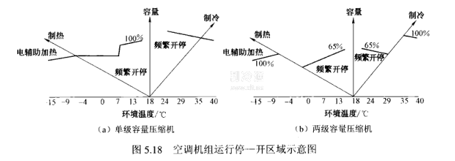 由圖5.18可看到,由于采用兩級容量的壓縮機,在夏季制冷和冬季制熱時,可在較廣的范圍內實現全容量的運轉,而減少了在頻繁關一停區域的溫度范圍,在較寬的一段溫度區域中處于匹配平衡的容量范圍內(在頻繁開一停與全容量運行區域的交界線重合區域)。
