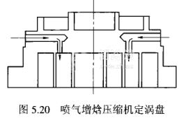 噴氣增焓技術(shù)在渦旋壓縮機(jī)中的應(yīng)用。圖5.19所示的制冷系統(tǒng),在冷凝器出口處旁通一段毛細(xì)管,并加設(shè)一控制電磁閥,向兩級容量渦旋壓縮機(jī)(開設(shè)旁通孔)內(nèi)引射制冷劑低壓蒸氣,可有效地在空調(diào)機(jī)組處于極端炎熱和寒冷的工況時,類似于“經(jīng)濟(jì)器”的辦法,提高壓縮機(jī)的質(zhì)量流量,冷卻壓縮機(jī)的渦旋盤,保證壓縮機(jī)的可靠性。按谷輪公司介紹,采用“噴氣增焓”技術(shù)的渦旋壓縮機(jī),可增加30%~40%的制冷量,及15%的性能系數(shù)(COP值)。圖5.20所和示為噴氣增焓技術(shù)的示意圖。