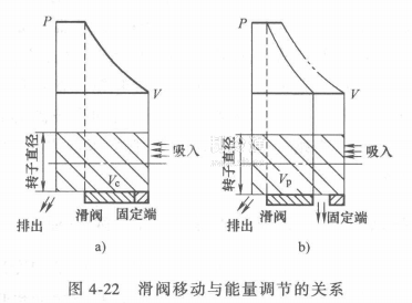 圖4-22表示滑閥的移動與能量調節的關系,a圖為全負荷時(100%)滑閥的位置,這時齒槽容積對Ve中的氣體全部排出。b圖為部分負荷時滑閥的位置,這時滑閥向排氣端移動,吸氣口即形成旁通口,吸進的氣體部分通過旁通口不經壓縮而返回吸氣側,轉子的有效工作長度減短,僅排出齒格容積對Vp中的氣體。滑閥連續移動時能量便在10%~100%的范圍內達到無級調節。