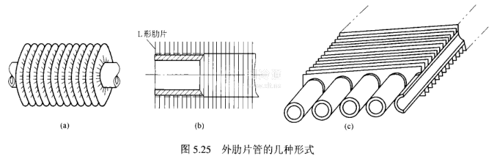 對(duì)于被冷卻介質(zhì)為空氣而言,蒸發(fā)器在降低空間溫度的同時(shí),還把空氣中的水蒸氣凝結(jié)成水而分離出來(lái),故也起到減濕作用。為了提高蒸發(fā)器的傳熱性能,除了選用導(dǎo)熱系數(shù)高的材料制做蒸發(fā)器外,還常常在管子的內(nèi)外壁上進(jìn)行助化處理以增大散熱面積。常見(jiàn)的外肋(起片)片管如圖5.25所示,內(nèi)肋片管如圖5.26所示。一般來(lái)說(shuō),制冷裝置中的蒸發(fā)器可分為氣冷式蒸發(fā)器和套管式蒸發(fā)器兩大類。