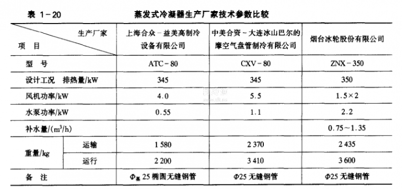 比較國內(nèi)三個主要蒸發(fā)式冷凝器生產(chǎn)廠家提供的數(shù)據(jù)(見表1一20),由于上海益美高的冷凝管采用橢圓無縫鋼管制作,相比較另外兩家用普通無縫鋼管而言,同樣獲取排熱量在350kW時,單件蒸發(fā)式冷凝器的用鋼和體積都會降低。