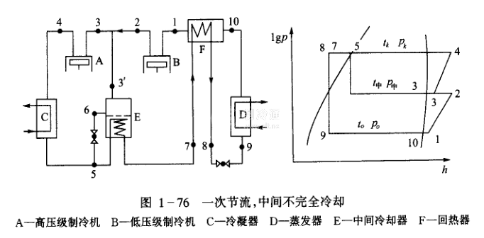 (1) 一次節(jié)流,中間不完全冷卻一次節(jié)流,中間不完全冷卻的方案,主要適用于氟利昂制冷裝置,采用回熱循環(huán)(見圖1一76)。