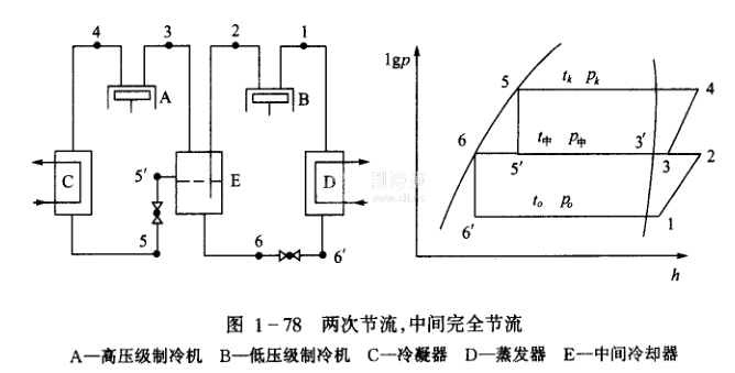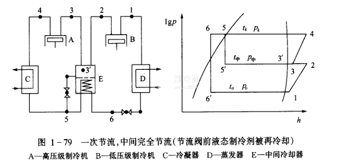 (3) 一次節(jié)流,完全中間冷卻節(jié)流閥前液態(tài)制冷劑被再冷卻。這個方案,雖然循環(huán)的能量指標沒有兩次節(jié)流完全中間冷卻的好,但卻具有兩個明顯優(yōu)點(見圖1一79)。