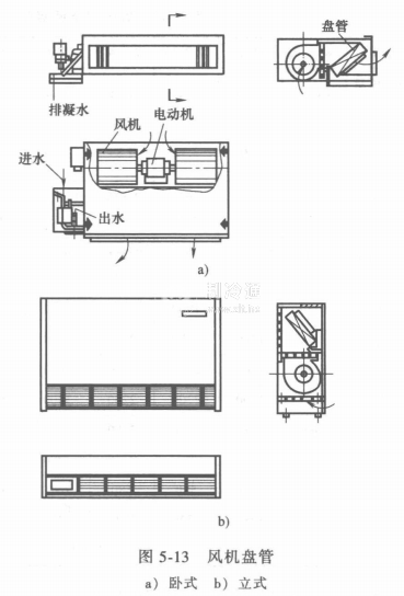 風機盤管加新風系統(tǒng)是中央空調的主要方式之一,因此風機盤管是空調設備的主要組成部分。風機盤管是一種將風機和表面式換熱盤管組裝在一起的裝置。風機盤管的形式有臥式、立式和頂置式等數種。風機盤管通常與冷水機組(夏)或熱水機組(冬)組成一個供冷或供熱系統(tǒng)。風機盤管是分散安裝在每一個需要空調的房間內(如賓館的客房、醫(yī)院的病房、寫字樓的各寫字間等)。為了縮小外形和體積以及降低氣流噪聲,多采用貫流式風機并用多級電動機驅動,以便對風量進行調節(jié)。圖5-13所示為臥式暗裝風機盤管和立式明裝風機盤管的結構圖。