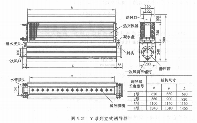 Y系列誘導器在結構上有很多相同的構件,差別較大的只是立式與臥式誘導器的盤管和凝水盤的布置有所不同,這兩類誘導器的結構分別介紹如下: