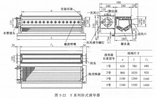 臥式誘導器圖5-22所示為Y系列臥式誘導器構造示意圖。圖示為臥式雙面回風誘導器,如果把位于上面的盤管拆除后裝上一塊擋板,則成為單回風誘導器。