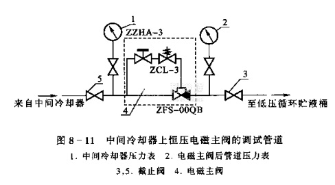 電磁恒壓主閥關閉是否嚴密,可在停車后關閉閥5,當中冷壓力未超過調定值前,壓力表2的指示值如有上升,說明其泄漏;反之,說明該閥關閉嚴密。