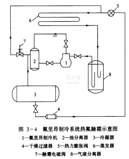 氟利昂制冷系統(tǒng)采用熱氟融霜的原理和熱氨融霜系統(tǒng)一樣。但氟利昂系統(tǒng)一般不設(shè)排液桶,通常將冷卻的液體排往氣液分離器,經(jīng)氣液分離后由壓縮機(jī)漸漸吸入,如圖3一4所示。