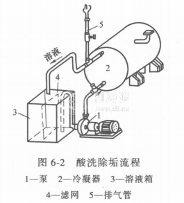 化學清除法。鹽酸溶解法所需的設備為耐酸泵和耐酸池。其流程如圖6-2所示,具體操作步驟如下: