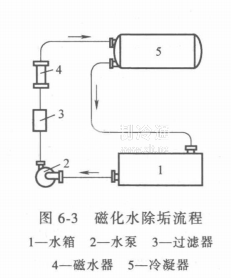 磁化水除垢方法。這種方法是在冷卻水進入冷凝器前,通過一個磁水器,如圖6-3所示。水流經橫向磁場后,改變了結晶條件,使構成硬質水垢的碳酸鈣的結晶變成帶磁化的粉末物質,這種物質酥松,很脆,粘固性與附著力極弱,它們呈松渣狀沉落下來,極易被排出冷卻管。