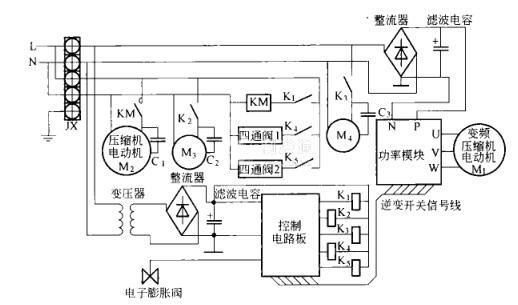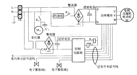 變頻、定速組合控制方式電氣原理如圖6.10所示。電路結構和控制技術及可靠性均有相當的要求。控制性能好,可大范圍調節空調系統輸出量,啟動穩定。在多臺壓縮機構成的戶用中央空調系統中(其中一臺用變頻壓縮機),可連接多個末端裝置。