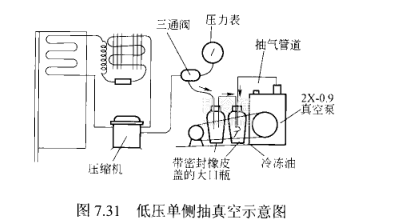 低壓單側抽真空是利用壓縮機上的工藝管進行的,而且可利用試壓檢漏時焊接在工藝管上的三通修理閥進行。低壓單側抽真空操作簡使,焊接點少,減少泄漏孔。缺點是制冷系統的高壓側中的空氣須經過毛細管抽出,由于毛細管的流阻很大,當低壓側中的殘留空氣的絕對壓力已達到133Pa以下時,高壓側殘留空氣絕對壓力仍會在1000Pa以上。雖然反復多次使制冷系統內的殘留空氣減少,卻很難使制冷系統的真空度達到低于133Pa的要求。低壓單側抽真室示意圖如圖7.31所示。