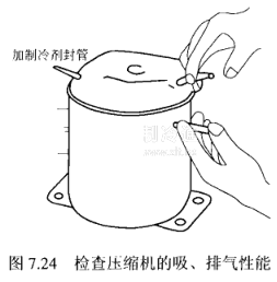 簡單的檢測方法是:焊開壓縮機上的吸排氣管,然后接通電源讓壓縮機啟動運轉(zhuǎn),再用手指使勁堵住壓縮機排氣口,若手指堵不住壓縮機的排氣口,則說明奈縮機的排氣性能良好。放開排氣口后,用手指輕輕堵住奈縮機的吸氣口,若堵住吸氣口的手指很快有了被內(nèi)吸的感覺,而且此時壓縮機運轉(zhuǎn)噪聲降低,則說明該壓縮機的吸氣性能正常,如圖7.24所示。若不是上述結(jié)果,則應判定該壓縮機的吸、排氣性能不良,不應繼續(xù)使用。