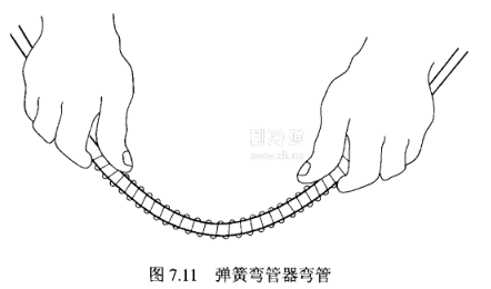 彎管器有各種不同的形式,圖7.10所示的只是其中一種。用粗細不同的鋼絲,繞制許多不同內徑和不同長度的彈簧,就成為一組彈簧彎管器。變管徑較大的彈簧計管器鋼絲較粗、內徑也較大,而繞成的彈簧也較長。