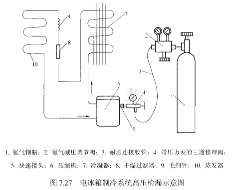 (1)高壓檢漏。高壓檢漏如圖7.27所示。從干燥過濾器與毛細管的連接處將管路分開并將分開的兩管各自封死。把回氣管從壓縮機上取下,并將壓縮機上接回氣管的管口堵死。這時可從工藝管上所摟的三通檢修閥上充注10~1.2MPa的氫氣,對高壓部分進行檢漏電冰箱來說,若有外器焊頭,還可以繼續(xù)將主冷凝器、副冷凝器以及防露加熱管檢漏,以確定泄漏發(fā)生于哪一部分。再根據(jù)不同的情況,采取補埋、更換零件或各分冷凝器以及丟掉部分管道等辦法加以解決。而空調(diào)器管道外器可拆下進行水中檢漏、漏點進行補焊即可。