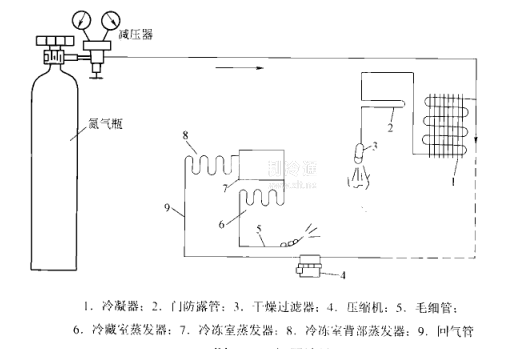 打開氯氣瓶閥門,調節減壓器,高壓側調至1.3MPa,低壓調至0.6~0.8MPa。這時,高不的氣體流程:氣瓶→冷凝器→門防露管→由干燥過濾器噴出,若無氨酸噴出,則可能是干燥過濾器臟堵,也可取下過濾器進行吹臟、懼堵驗證。低壓側的氣體流程,氣瓶→轉換開關→壓縮機→回氣管→冷凍室背部蒸發器→冷凍室蒸發器→冷藏室蒸發器→從毛細管吹出。若無氣體噴出,則可能屬于毛細管臟堵。由于毛細管的進端多與蒸發器連接,對吹臟式蒸發器可增壓到0.9MPa;鋁盤管式蒸發器可增壓到1.1MPa進行吹堵驗證。一旦吹堵保持數分鐘無效,只有打開箱體焊下毛細管再做驗證,這樣也有蒜發器吹油、吹臟或吹堵。吹洗后的制冷系統不可久放,最好更換過濾器后及時恢復。