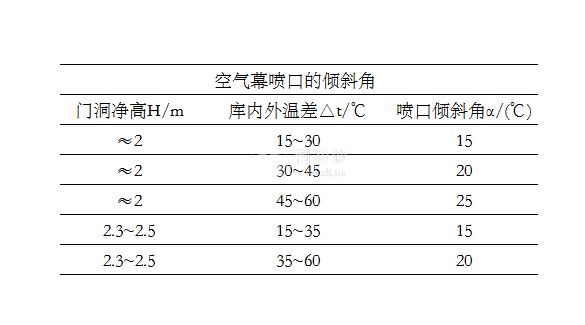 安裝空氣幕時要保證噴風口與門框有適當的傾斜夾角。不能垂直安裝,傾斜夾角不宜過大也不宜過小。過大時,空氣幕噴風引向庫外的冷量多,射流就會遠離門框,使門邊漏出冷空氣;夾角過小時,則引入庫內的空氣量多,回流區大,進入庫內的熱量和水分也多,空氣幕安裝時,傾斜角一般以夏季溫差為準,不同情況下空氣幕噴口斜角見下表。