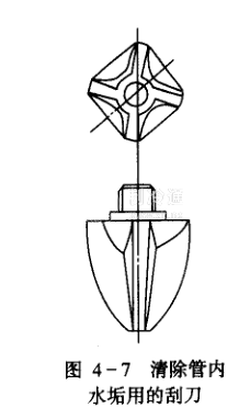 這種方法適用于清除殼管式冷凝器的管內水垢。將臥式殼管式冷凝器兩端的封頭拆下,若是立式殼管式冷凝器則將接水板拿掉,用管道疏通機進行除垢。在管道疏通機的鋼絲軟軸上接上特制的刮起刀(圖4一7),將刮刀和鋼絲軟軸插人冷卻管內,開動管道疏通機就可以刮除水垢。