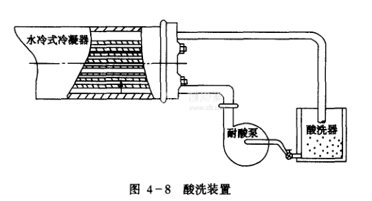 將系統中的制冷劑抽出,關閉冷凝器進、出水管,并拆下進、出水管的接管。將準備好的耐酸泵、酸洗器(酸洗池)及連接管道接在冷凝器的冷卻水進、出口處(圖4-8),構成酸洗裝置。啟動耐酸泵,酸洗液沿冷凝器管道和酸洗器循環流動。溶解冷凝器管道中的水垢。酸洗液的pH很小,與水垢反應時pH會升高。清洗過程中應每30min測定一次pH,直到pH不再升高(說明水垢已清除干凈),將酸洗液中和后排掉。然后用1%的氫氧化鈉溶液對冷凝器進行循環中和清洗15min,再用清水沖洗,即可恢復冷凝器的使用。