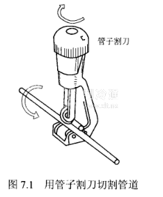 用管子割刀切割管道的方法如圖7.1所示。首先將管子展直,銅管若彎曲,則不能正確地將銅管切斷,或者是斷面傾斜,或者是斷口不平,給進(jìn)一步加工帶來麻煩。