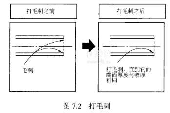 正確的切割方法不是直接用割刀將管子切斷,而是在銅管即將切斷之前就把管子割刀取下,再用手將銅管彎折至斷開,這樣就能減少毛刺。無論用何種方法切割銅管,當(dāng)管子切斷之后都要用絞刀或管子割刀后面配管子內(nèi)緣的毛刺刮凈,如圖7.2所示。打毛刺時(shí),應(yīng)尺可能將毛刺去凈,直與壁厚相同,喬畢后用毛刷刷凈端面,并清除管內(nèi)碎屑。