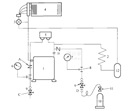 檢查制冷系統有無泄漏,也可采用真空試漏的方法。具體的操作方法是:在壓縮機的工藝上接上帶真空的三通閥,三通修理閥接頭的耐壓膠管與真空泵連接。對制冷系統抽真空1~2h后,在真室泵的出氣口接上膠管,將膠管口放入盛有水的容器中,邊抽真空,邊觀察膠管口有無氣體排出。若對制冷系統抽真空1~2h后仍有氣體排出,則說明制冷系統有泄露孔。也可以對制冷系統抽真空到制冷系統內的壓力為133.3Pa時,關閉三通修理閥門,靜置12h后,觀察真字表上上的壓力值有無升高。若壓力升高,則說明制冷系統有泄漏點存在。然后再用其他方法找到泄漏孔,進行補漏,直到排除泄漏。