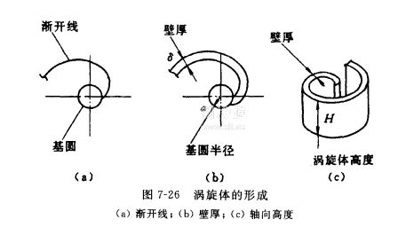 渦旋式壓縮機的工作時是由兩個渦旋體嚙合而成,渦旋體的型線(圖7-26)一般采用圓的漸開線,其基圓半徑為α,利用漸開線的不同起始角形成渦旋體的壁厚δ。當軸向具有一定高度H時即形成渦旋體。