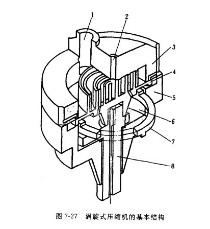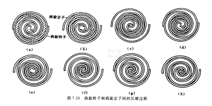 (圖7-28a~g,每圖相隔偏心軸轉角 120°)。壓縮過程一直持續到該兩小室的空間合并為一中心室和排氣口相通為止,然后開始通過排氣口的向外排氣, 見圖7-28(h) ,并持續到小室的空間消失為止,此即排氣過程。在上述這些過程進行的同時,從圖7-29的(b)、(c)、(e)、(f)、(h)看到,外圈型面多次開啟,把氣體不斷吸入到渦旋外圖小室,直到外圖端部閉合, 見圖7-28(d)、(g),多次完成其吸氣過程。由此可見 ,在渦旋式壓縮機中,吸氣、壓縮、排氣等過程,是同時和相繼在不同渦旋小室中進行的.據此,可以進而理解到,渦旋式壓縮機中的壓縮過程是一具有一定的內壓比,其中不需要設置吸氣閥和排氣閥,不存在余隙容積,工作中也就沒有膨脹過程。此外,由最外圈壓縮室的形成至最內圈排氣結束,需經轉子多次平移轉動才能完成,從往復式、滾動轉子式與渦旋式壓縮機的壓縮過程的比較得到,渦旋式壓縮機中氣體壓縮、排氣過程最為緩慢,流動損失最小。