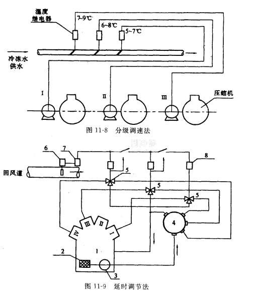 ②延時調節法。延時調節法與分級調節法不同,它采用一個繼電器控制被調對象 ,當被控參數達到上限或下限值時,發出增載或卸載信號,但需經一定時間延時,方能對壓縮機或氣缸進行控制。圖11-9所示的空氣調節系統,由八缸制冷壓縮機帶動直接蒸發式空氣冷卻器,房間空氣溫度要求維持在19℃~21C℃范圍內,在回風道安裝有溫度繼電器,其整定值的上、下限分別為19℃和21℃ ,當回風溫度達到21℃時(即室溫),經過一定延時,逐次開啟電磁三通閥 ,給氣缸的卸載裝置供油,使氣缸投入工作,反之,當回風溫度降低到19℃時,經過一定的延時,逐次關閉電磁閥 ,使氣缸卸載裝置回油,氣缸則處于不工作狀態。