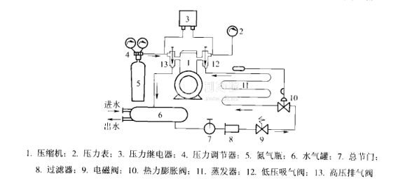 氮氣打壓檢漏法:給制冷系統打入高壓氮氣檢漏是一種比較可靠的檢漏方法,它不會使制冷系統產生冰堵故障。氮氣打壓檢漏操作如圖7.37所示。充入高壓氮氣前,首先將制冷系統的從閥件都開啟,若制冷系統有電磁閥,則還要將電動機與壓縮機的傳動皮帶拆下(或為使電磁閥開啟,也可將電磁閥接線從原電路上拆下,另接控制電源單獨供電),再將高壓氮氣瓶與高壓排氣閥利用多用口相連接,并使排氣閥呈三通狀態,向制冷系統打入0.8MPa高壓氮氣,此時給機組通電,使電磁閥開啟(電動機室轉),然后用濃度適宜的肥皂水涂抹各個接頭、接口等易泄漏處,出現氣泡處即為泄漏點。若電磁閥是接在冷卻水路上(即水冷式機組),則電磁閥與制冷系統無關,可直接從壓縮機高壓排氣閥多用口充入高壓氮氣進行檢漏。