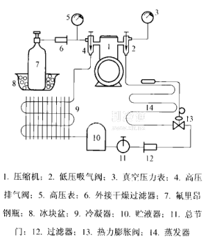 該操作也就是前面常提到的“盤氣"。盤氣前在壓縮機上分別裝接高壓力表和低壓力真室表,并順時針開啟吸氣截止閥1/2圈,壓力表有指示值,排氣凈開始排氣后再擰緊接管螺母,然后關閉貯液器的出液截閥(或總節門)。