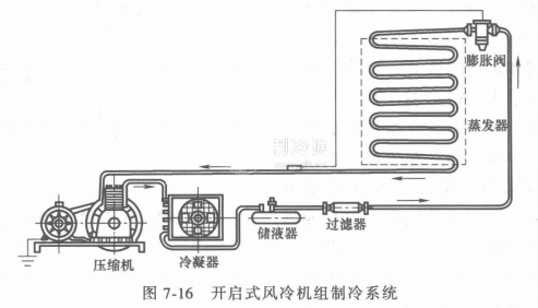風冷冷藏箱采用的主要制冷方式為單級蒸氣壓縮式制冷,制冷劑多用R12(或R22, R502)。基本制冷系統為常規制冷系統,即制冷劑經壓縮后排出至冷凝器,制冷劑經過冷凝、節流、吸熱氣化再被壓縮機吸入,完成制冷循環,實現制冷,為一單級制冷系統。如圖7-16所示。