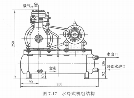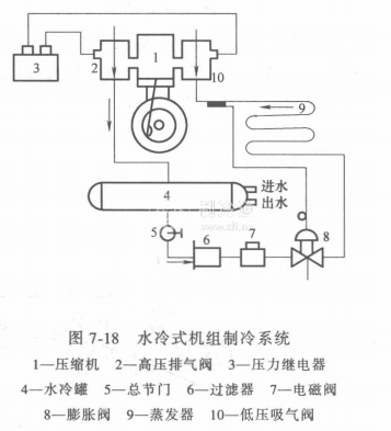 水冷式機組由壓縮機、水冷罐(既是冷凝器又是儲液器)、電磁閥、蒸發器、膨脹閥等組成。圖7-17所示為水冷式機組結構,圖7-18所示為水冷式機組制冷系統。