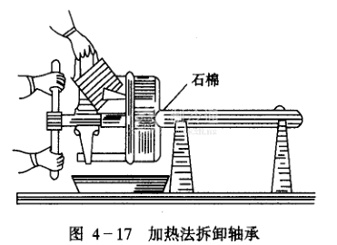 要均勻。如將機油加熱到90一100℃,澆在軸承的內圈上。為防止軸受熱,在靠近軸承內圈的部位包上一層石棉(見圖4一17)。加熱可在沸水或熱油池中進行,以保持零件加熱的均勻,減少變形。被加熱零件的溫度不宜超過120℃,否則容易變形而使零件失去原有的精度。