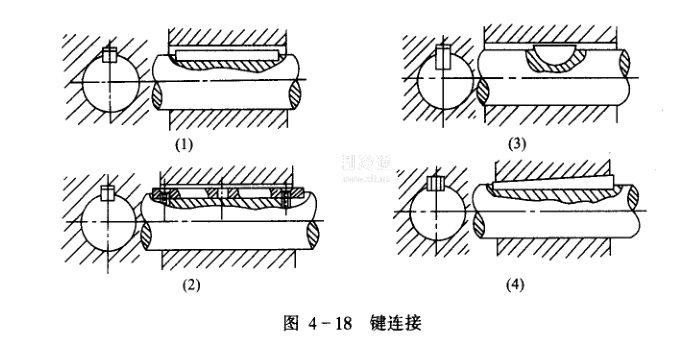 鍵連接的種類和形式很多,根據鍵的形狀不同可分為平鍵、半圓鍵、斜鍵和鉤頭鍵等。鍵的連接形式如圖4一18和圖4一19所示。