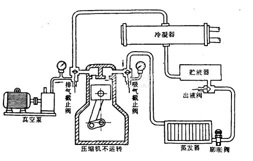 對全封閉式壓縮機所組成的制冷系統,是不能用本身壓縮機來抽真空的,故需要另接真空和泵來完成這項工作。由較大型的壓縮機或半封閉壓縮機所組成的制冷系統,一般也不宜用自身壓縮機抽空。因大缸徑壓縮機用自身抽空有危險(因為排氣口較小),而半封閉壓縮機用自身抽空時,電動機冷凍條件差,用真空泵抽真空的示意圖如下圖所示。